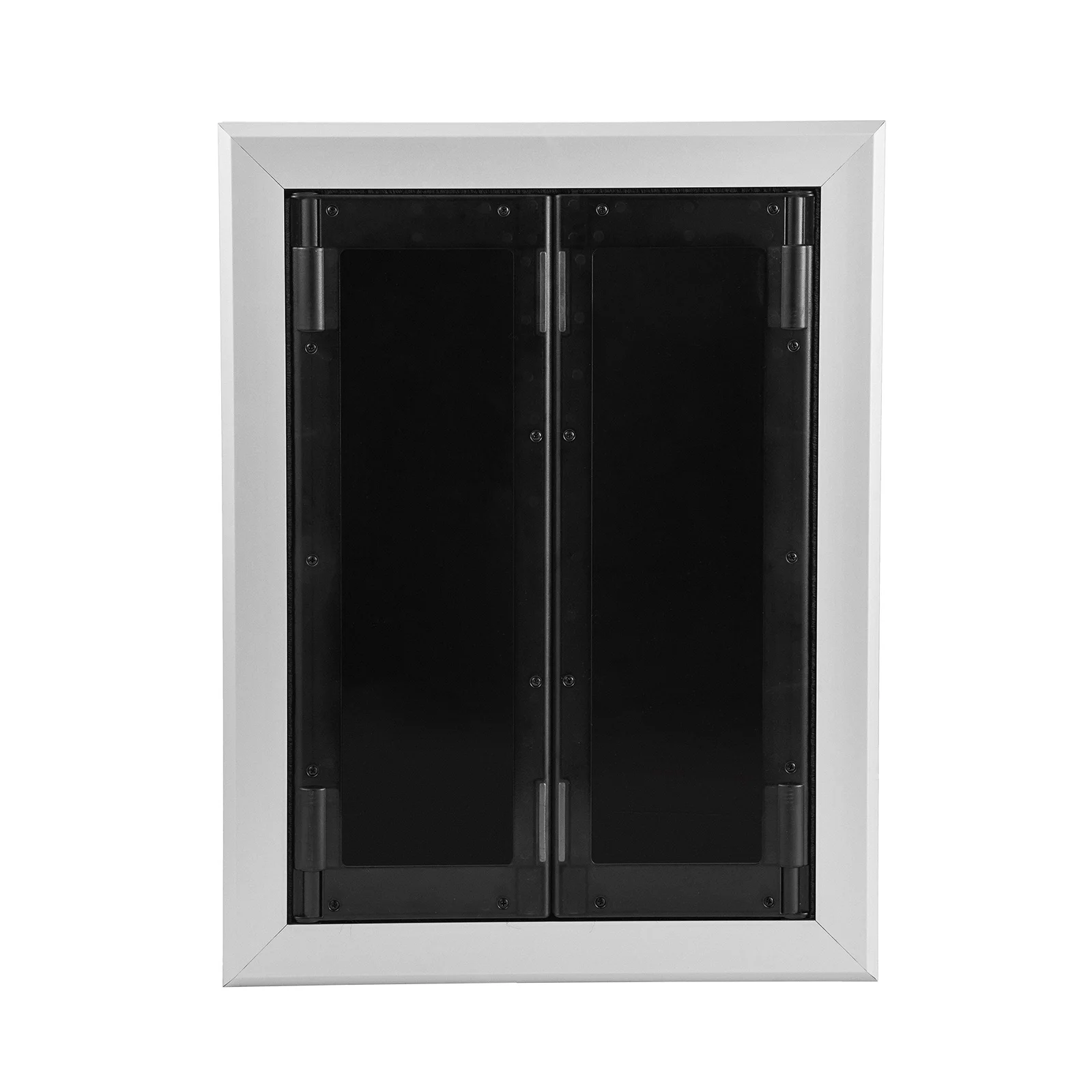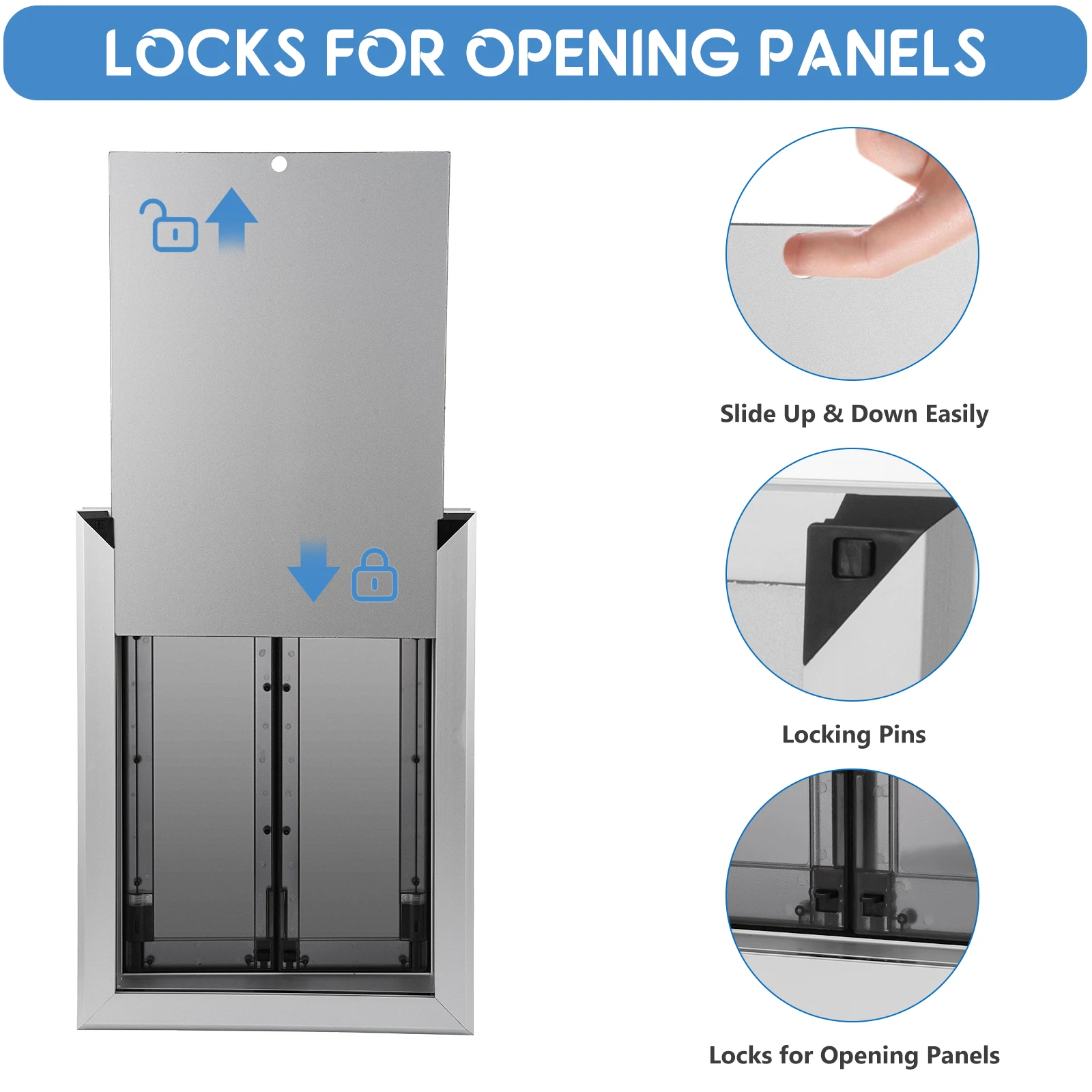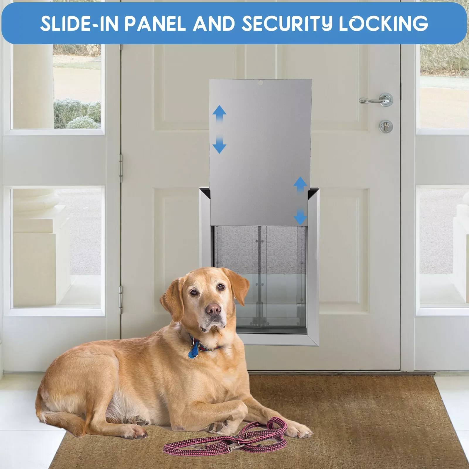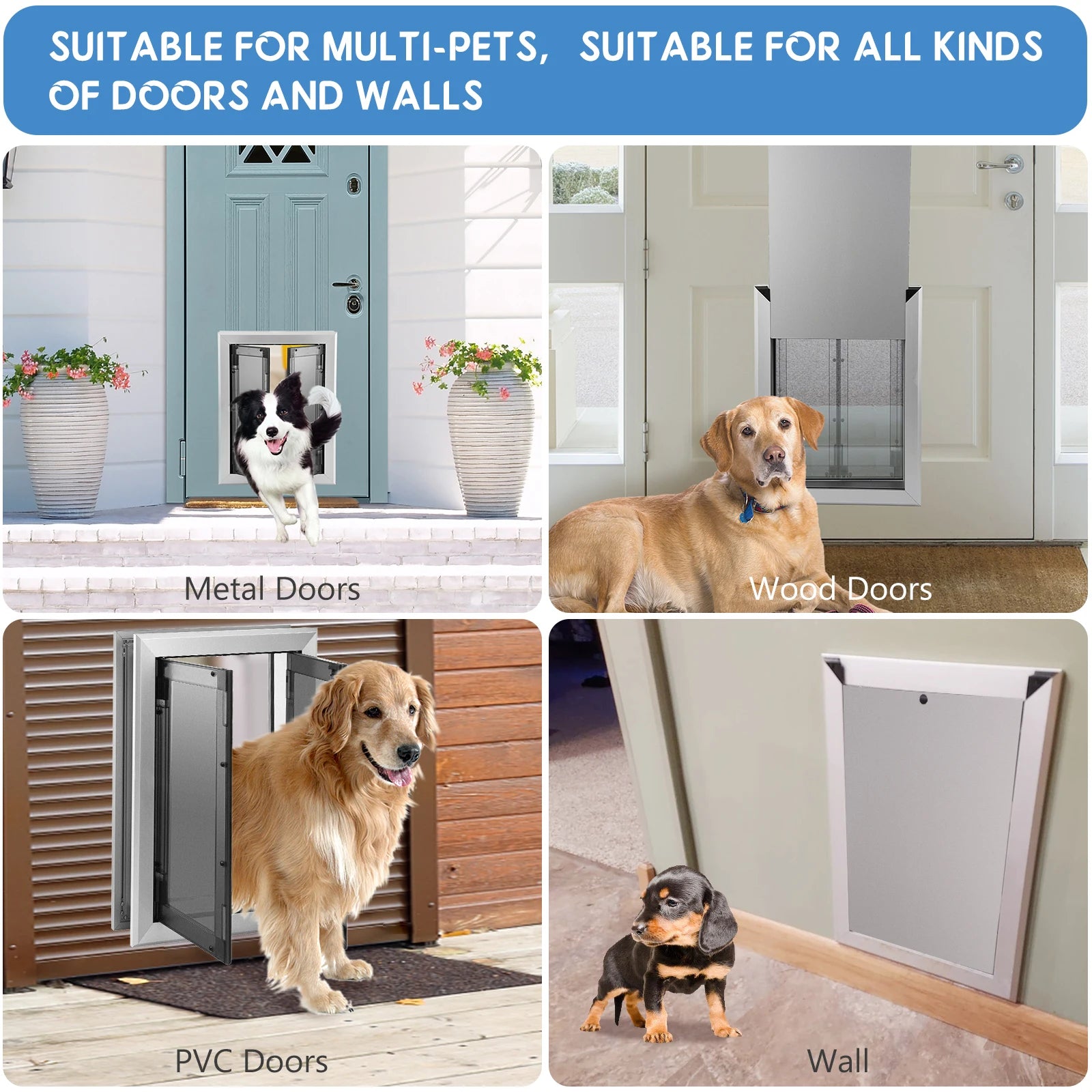 Ingenious Details: The doggy door comes with a durable aluminum slide-in panel, security sliding lock design. The double door panels comes with 4 security locks, each door panel has a lock at the top and bottom. These can keep you and your family safe at night or when you are not home by keeping other animals out of the house.