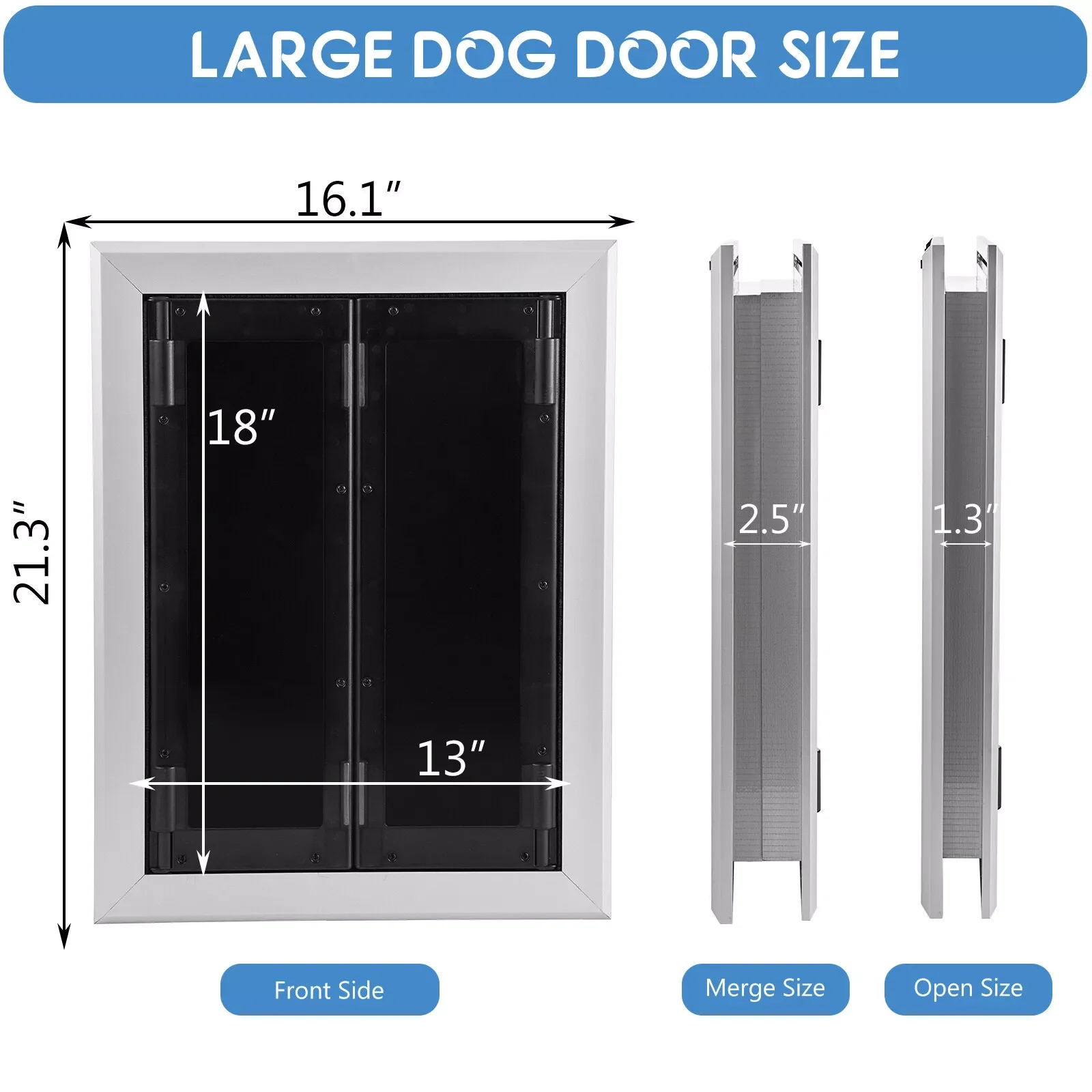 Door Dimension: The large dog door frame size is 16'' (W) x 21''(H).Flap opening is 13(W) x 18(H). Cutout size in door/wall: 13 2/(W) x 18 2/3(H). It fit for doors or walls from 1.3 to 2.5 inch thick.This pet door suitable for large dogs and cats.