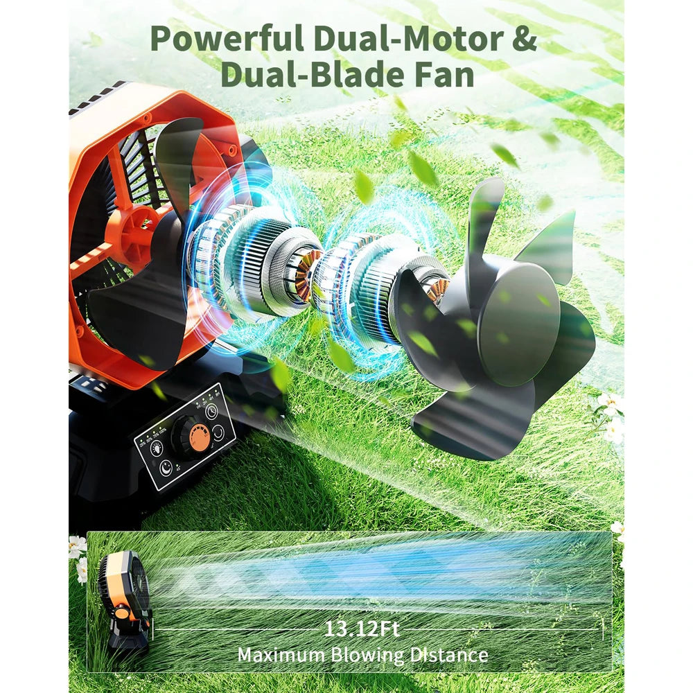 coldSky camping fan has built-in powerful dual motors and double-layer fan blades, offers 8 adjustable wind speeds. This advanced tech helps the turbo to drive more air in a faster way, Wind power is twice that of traditional outdoor fans. It can reach a blowing distance of up to 13.12Ft, Makes you feel cool quickly, perfect for outdoor use in hot summer, as well as for use as a jobsite fan, industrial fans and ventilador fan